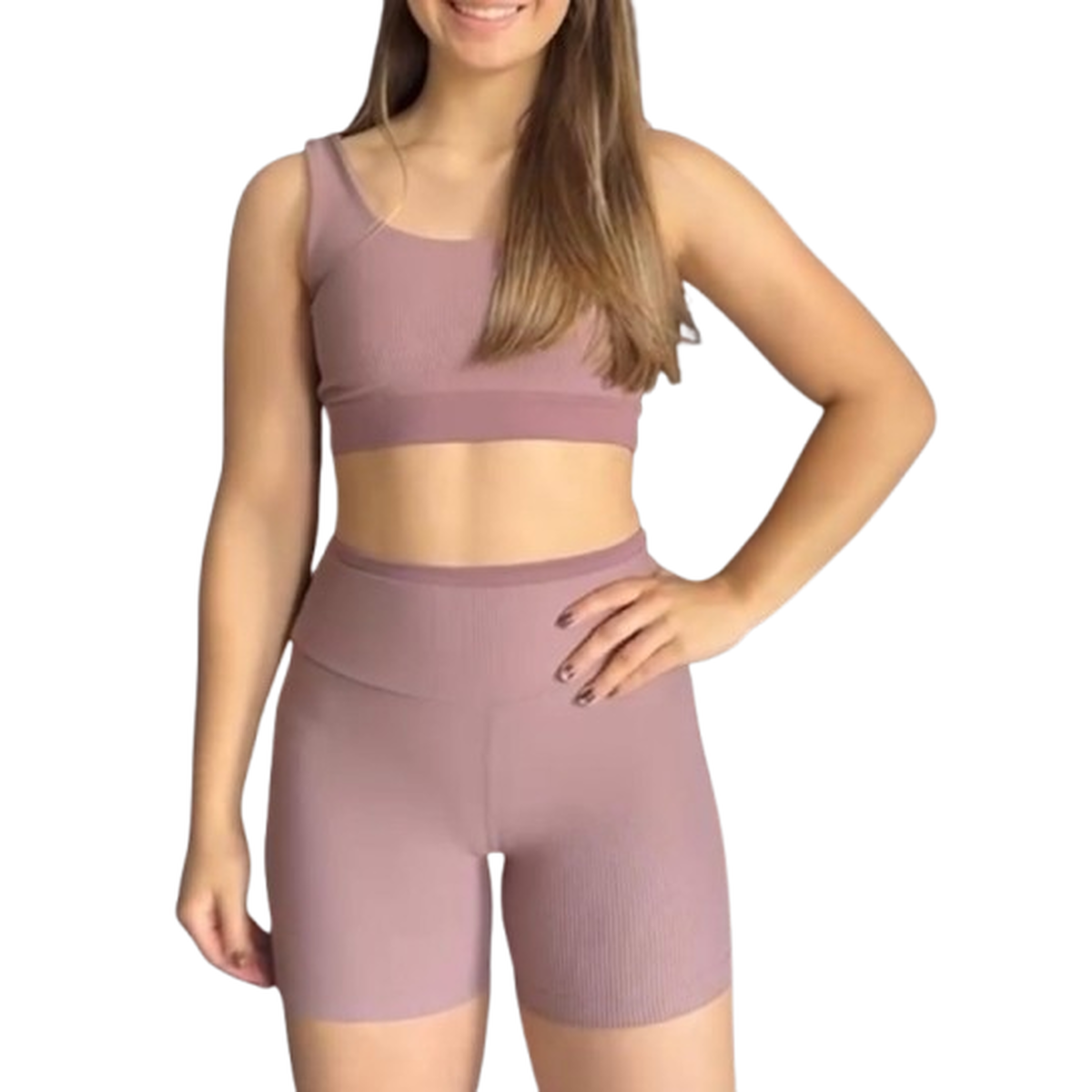 Esse conjunto tem um tecido elástico que se adapta bem aos movimentos, sendo ideal para treinos, a textura canelada confere um visual mais sofisticado e está em alta nas tendências de moda fitness. As peças podem ser usadas juntas ou separadas, sendo versáteis para treinos e até mesmo para looks casuais.